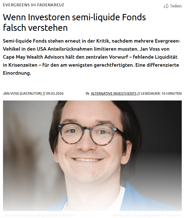 Our view is that the central criticism – a lack of liquidity in times of crisis – is also the least justified. Semi-liquid funds were never designed to function as substitutes for liquid investments, especially in times of market turbulence. They are long-term oriented investments, despite their relatively better liquidity profile - so criticizing them for illiquidity in a crisis is a bit like criticizing a term deposit for not being immediately accessible. Or as we like to say, tools only work as intended.